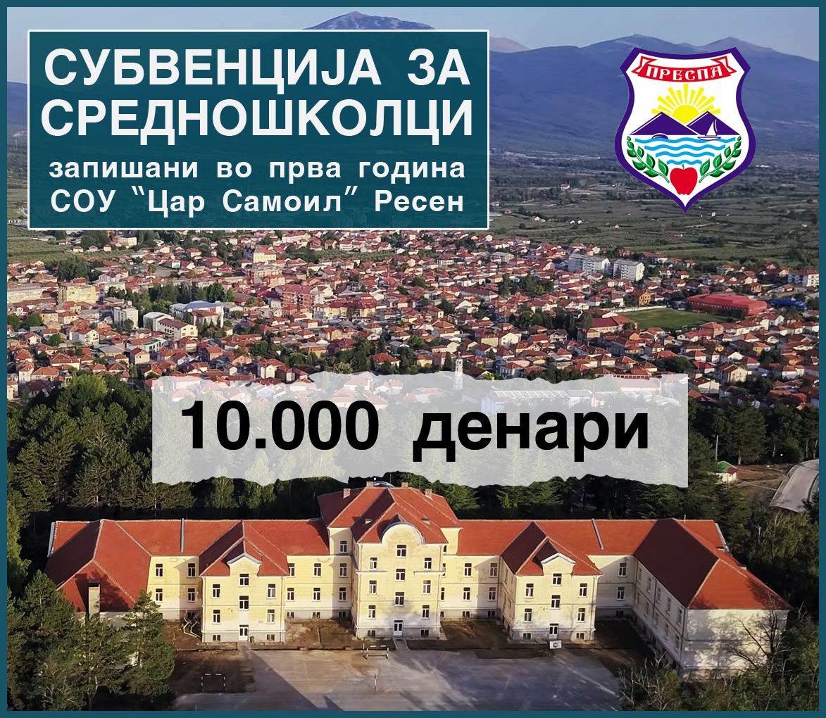 Општина Ресен, покрај традиционалната еднократна парична помош за првоодделенчиња, оваа година воведува нова мерка за поддршка на образованието. За прв пат, ќе биде доделена еднократна парична помош во износ од 10.000 денари за сите ученици кои ќе се запишат во прва година во СОУ „Цар Самоил“ – Ресен.