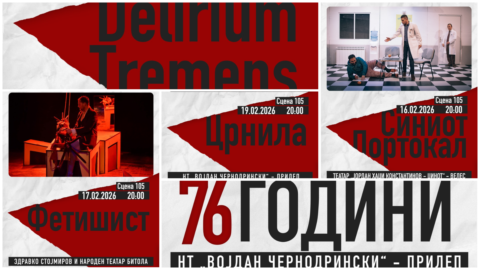 Народниот театар „Војдан Чернодрински“ – Прилеп од 16 до 19 февруари ќе ја одбележи 76-годишнината од своето основање со четиридневна театарска програма на Сцена 105, со почеток во 20:00 часот.