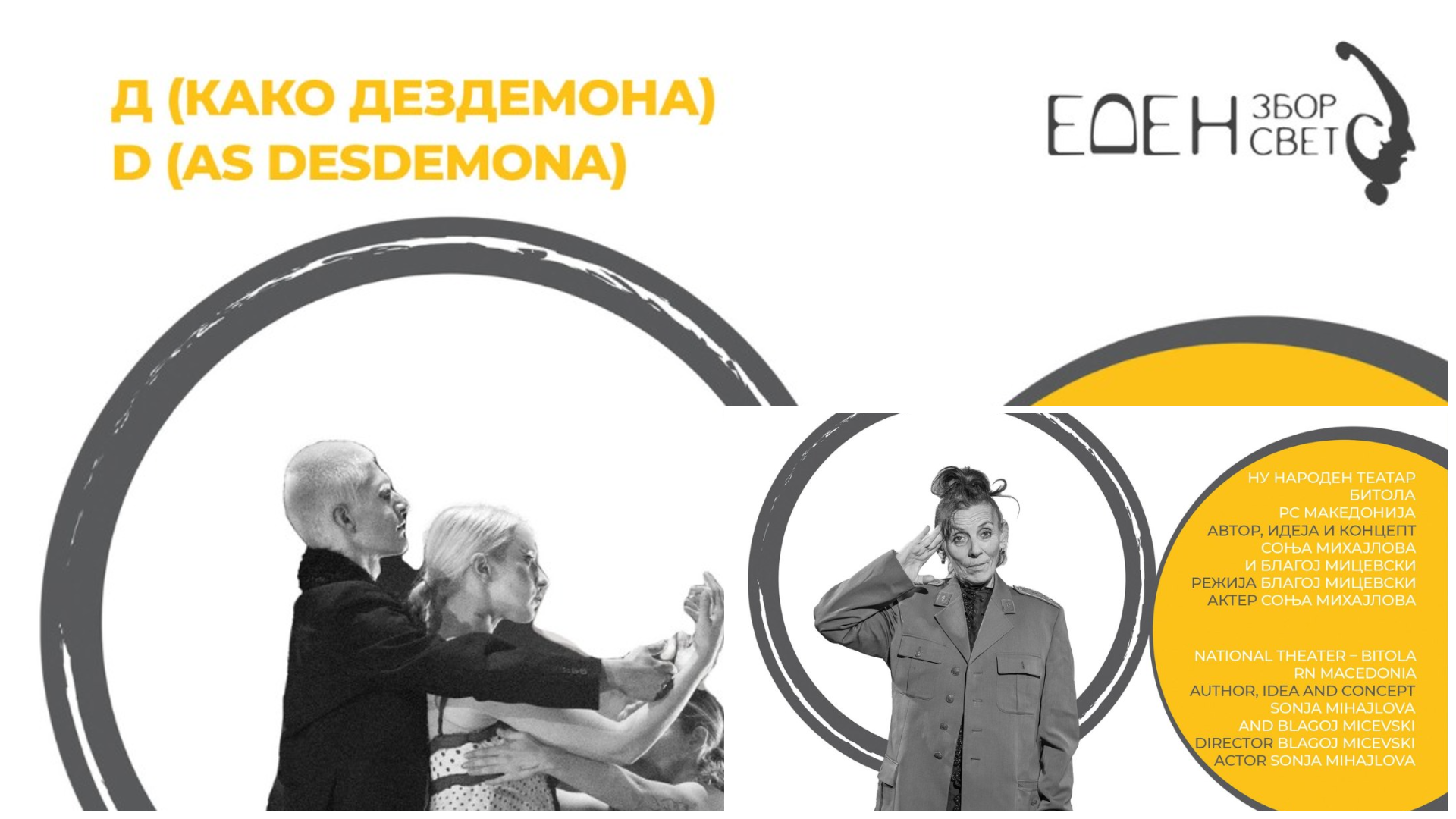 На свеченото отворање ќе биде изведена претставата „Д (Како Дездемона)“ во режија и кореографија на Рисима Рисимкин, а фестивалот ќе заврши со монодрамата „Куфер.мк“ на доајенката на македонското актерство Соња Михајлова, добитничка на наградата за животно дело на фестивалот „Војдан Чернодрински“.