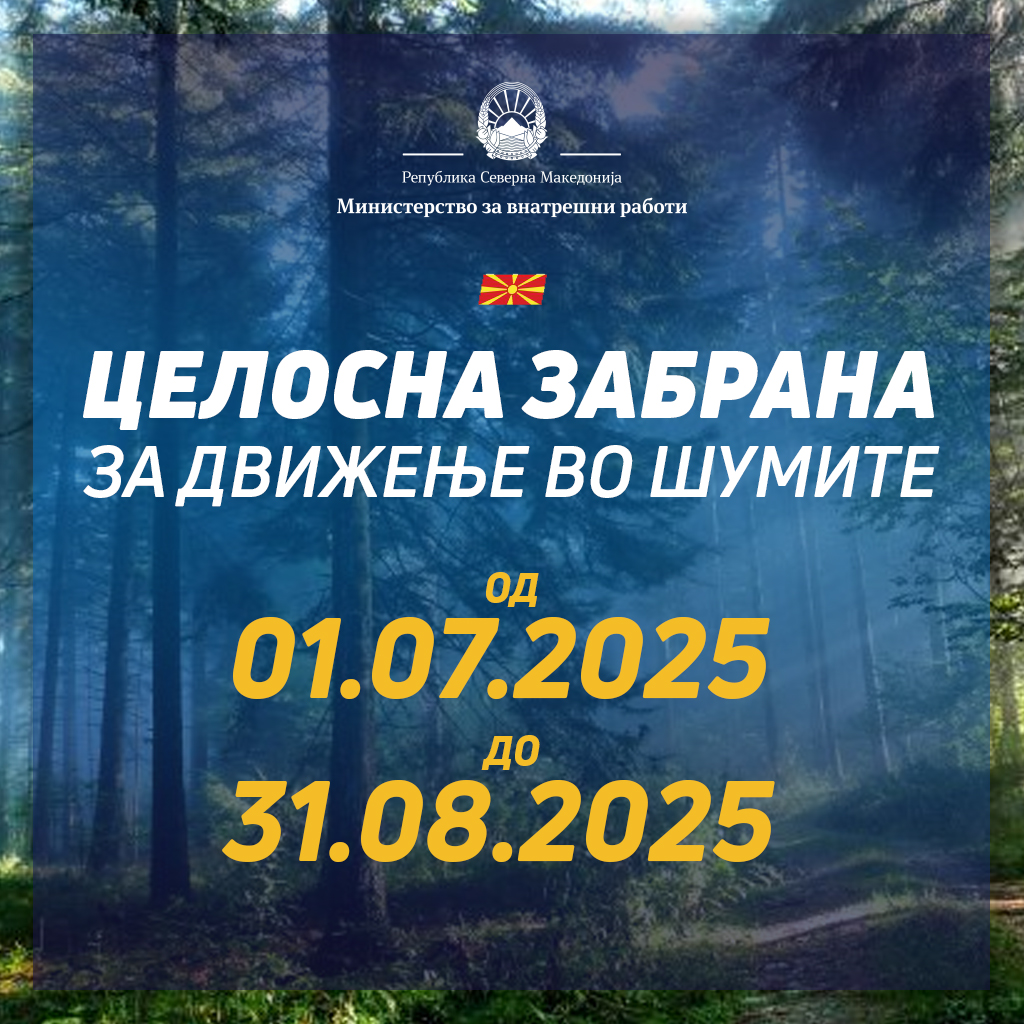 Министерството за внатрешни работи ги известува граѓаните дека согласно насоките на Владата по барање од корисниците на шумите – ЈП „Национални шуми“ и Националните паркови кои управуваат со заштитените подрачја, Министерството за земјоделство, шумарство и водостопанство даде согласност за целосна забрана на движење во шумите и шумското земјиште. Согласноста е издадена врз основа на членот 57 став 3 од Законот за шумите, поради зголемена опасност и превенирање од појава на шумски пожари на отворен простор.