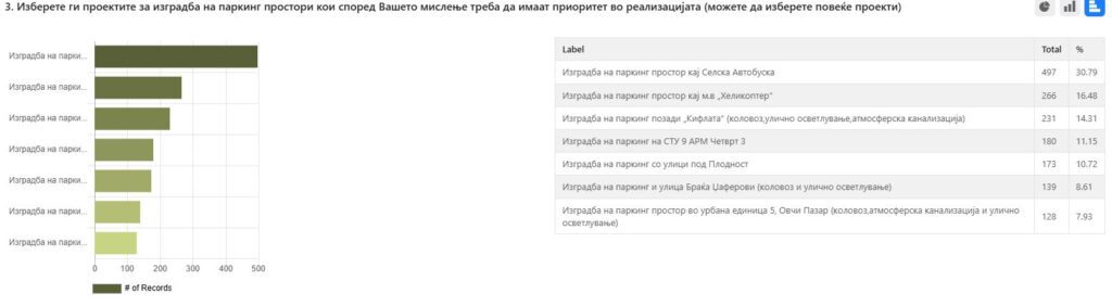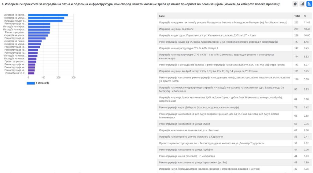 Граѓаните исто така имаа можност да предложат нови проекти за кои сметаат дека треба да бидат приоритетни за реализација во Битола. Од добиените одговори, во врска со проектите за кои општината е подготвена со документација и кои можат да започнат со реализација, граѓаните ги ставија следните 5 проекти на врвот на приоритетите: