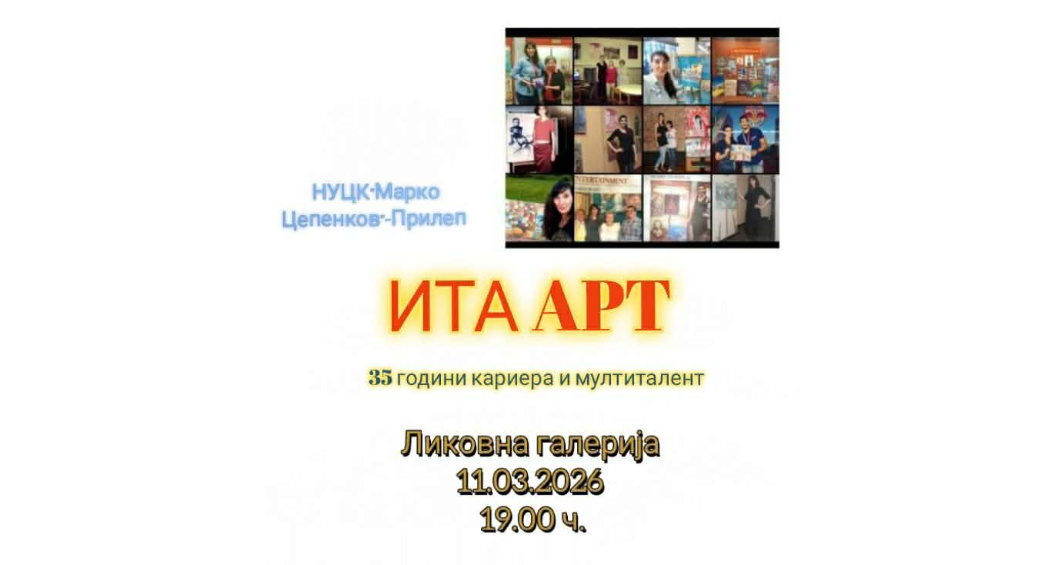 Ретроспективна изложба на слики од уметницата Ита ТС Арт ќе биде отворена на 11 март, среда, од 19 часот во Ликовната галерија на ЦК „Марко Цепенков“.