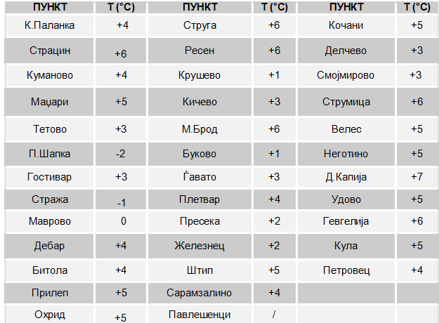 Врнежи од снег со променлив интензитет се бележат на Попова Шапка, во Маврово и на планинскиот превој Стража. На планинскиот превој Буково врнежите се од дожд и снег – (лапавица).