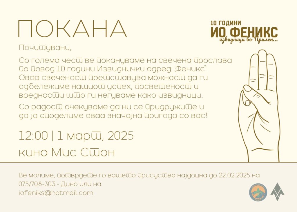 Ни претставува особена чест и задоволство да ве поканиме на свечена прослава по повод 10 годишното постоење на нашиот извиднички одред „Феникс“ – Прилеп. Свечената прослава ќе се одржува на 1 март 2025г. во 12 часот во киното Мис Стон во Прилеп.