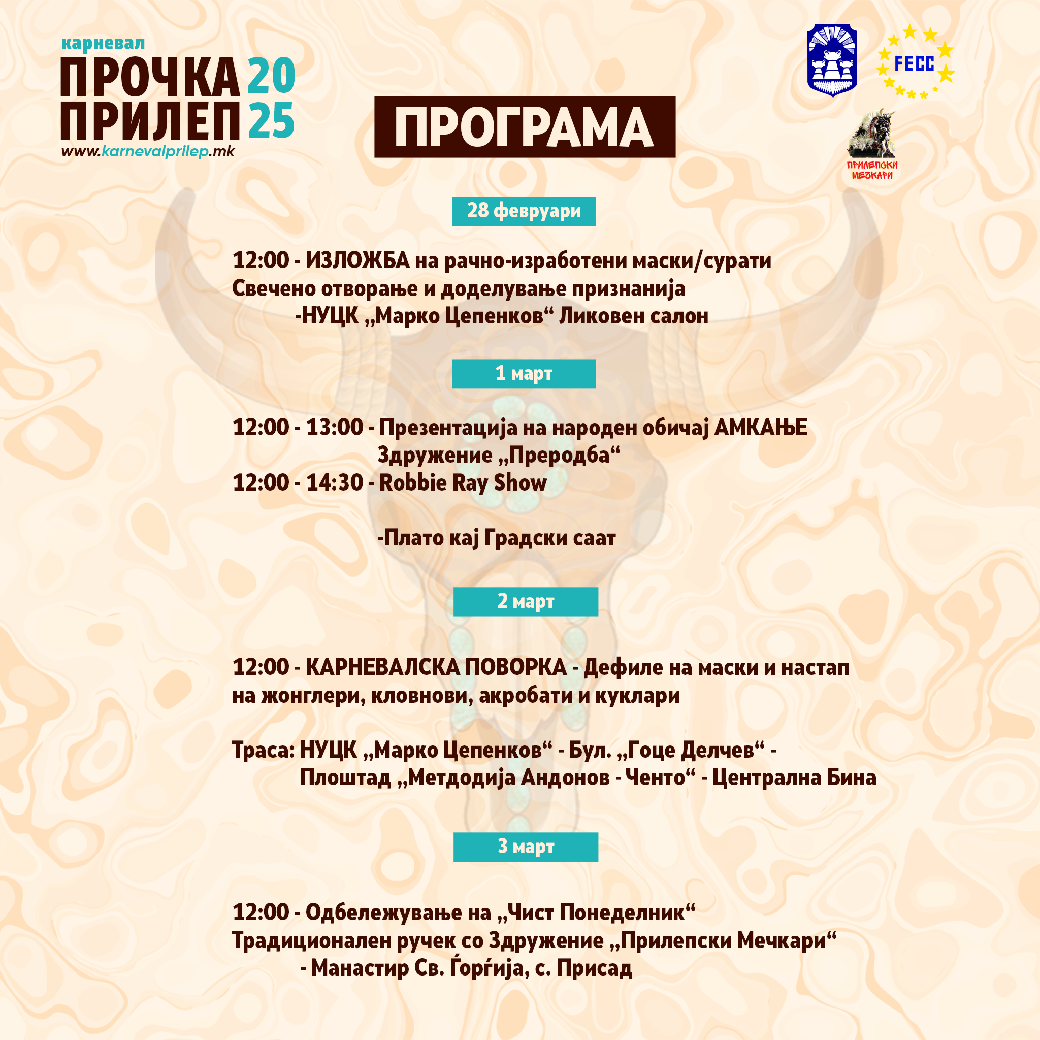Програмата започнува во петок на 28 февруари со изложбата на рачно-изработени маски во 12:00 часот во Ликовниот салон на НУЦК „Марко Цепенков“.