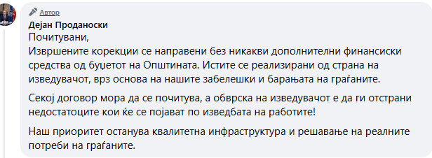 „Извршените корекции се направени без никакви дополнителни финансиски средства од буџетот на Општината. Истите се реализирани од страна на изведувачот, врз основа на нашите забелешки и барањата на граѓаните. Секој договор мора да се почитува, а обврска на изведувачот е да ги отстрани недостатоците кои ќе се појават по изведбата на работите“, истакна Проданоски.