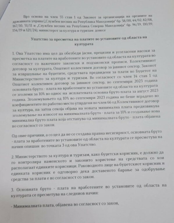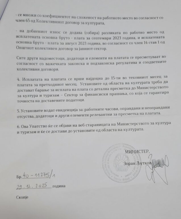 Синдикатот најавува дека нема да дозволи платите во културата да се пресметуваат по, како што велат, „министерска математика“ и дека повторно ќе ги искористи сите расположливи правни механизми – од управни спорови до иницирање постапки за утврдување кривична одговорност – со цел да се заштитат правата на вработените во културата.