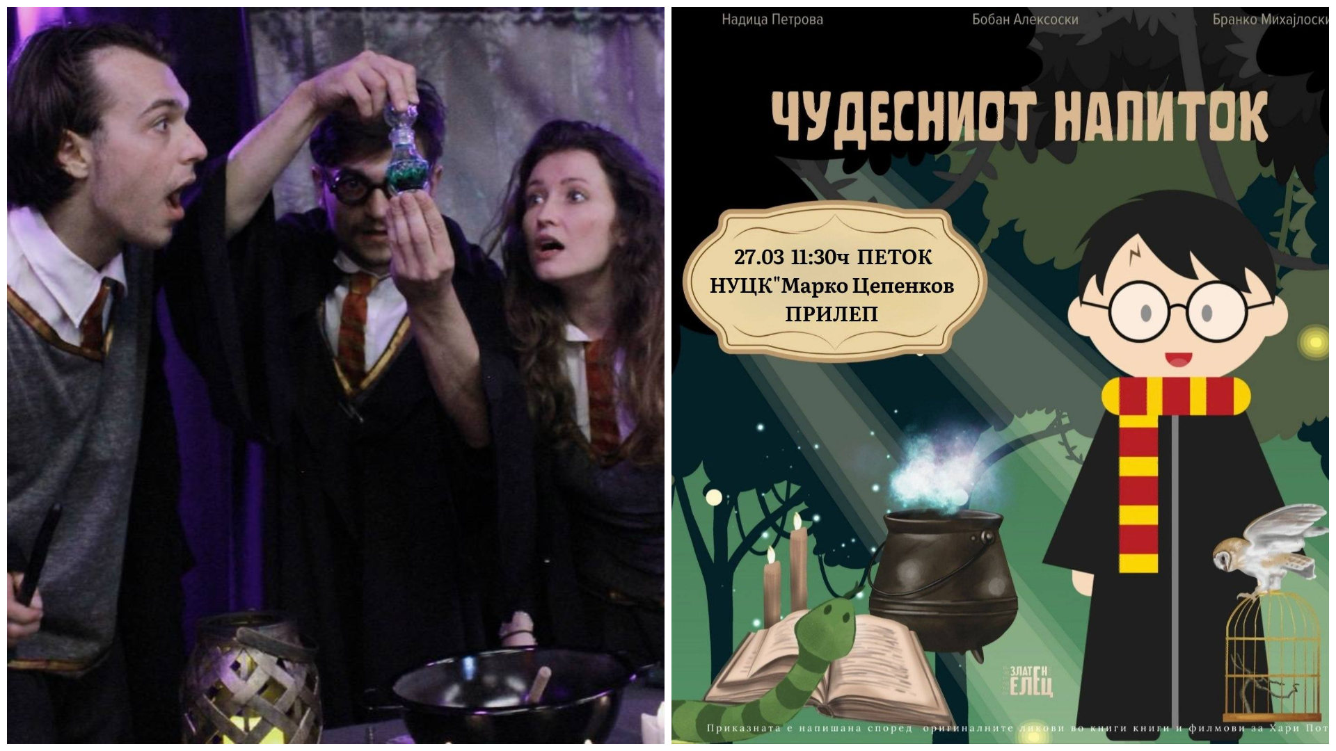 Театарот Театар Златен Елец на 27 март ќе гостува во НУЦК „Марко Цепенков“ со детската претстава „Чудесниот напиток“, која ќе се одигра на Големата сцена со почеток во 11:30 часот.