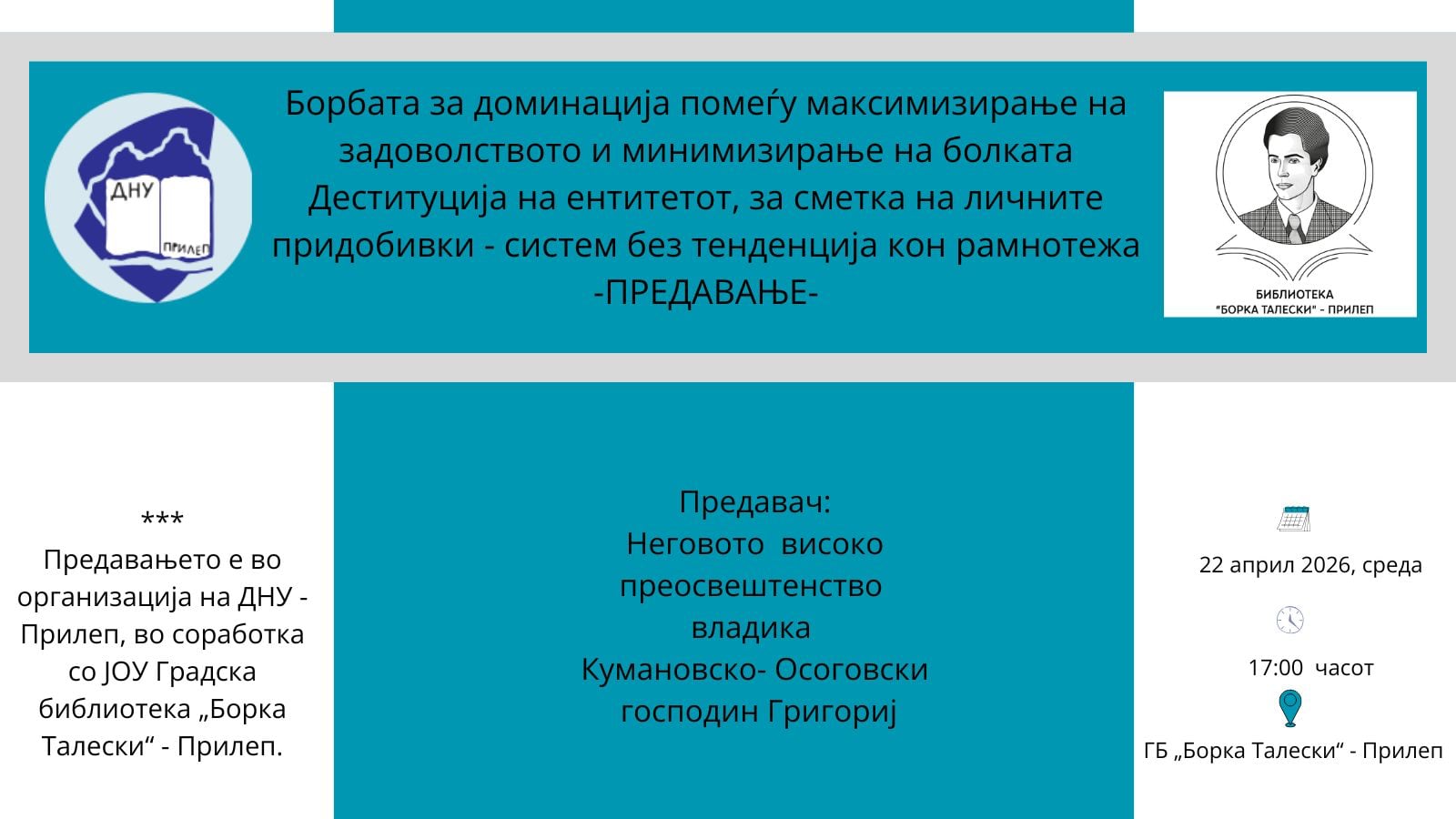 Во организација на Друштвото за наука и уметност (ДНУ) од Прилеп, на 22 април 2026 година (среда), во просториите на градската библиотека „Борка Талески“ во Прилеп, со почеток во 17:00 часот, ќе се одржи предавање на владиката Кумановско-Осоговски, г. Григориј, кој е и член на Друштвото.