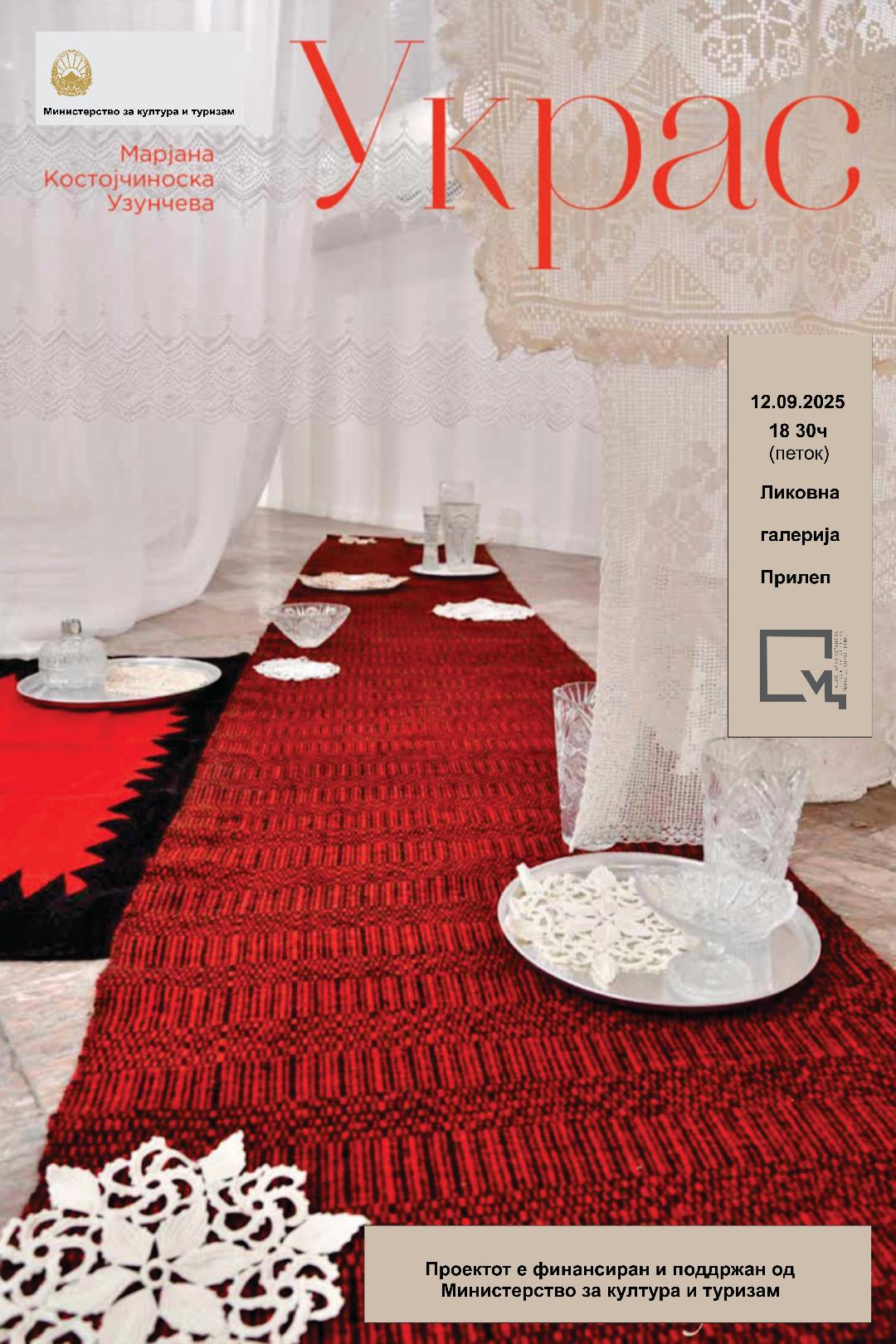 На 12 септември 2025, петок од 18.30 часот во Ликовната галерија од ЦК „Марко Цепенков“ ќе биде отворена изложбата „Украс“ од уметницата Марјана Костојчиноска Узунчева. Изложбата ќе биде отворена седум дена.