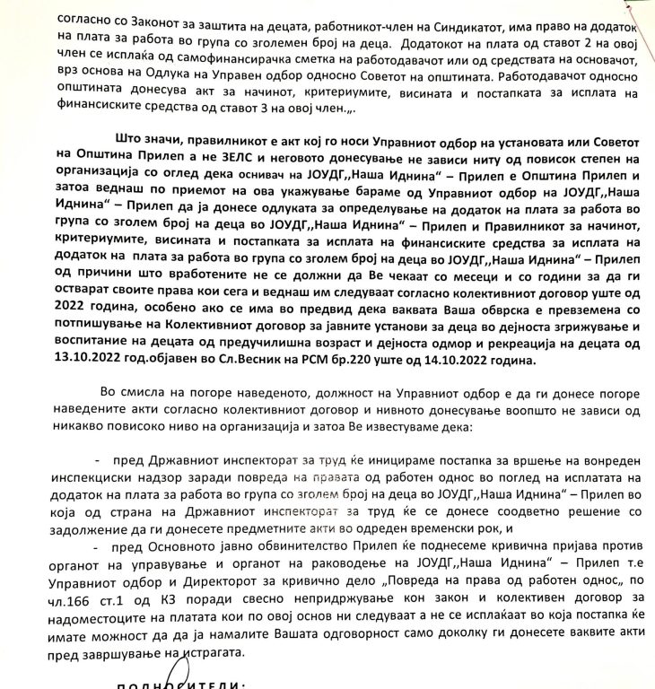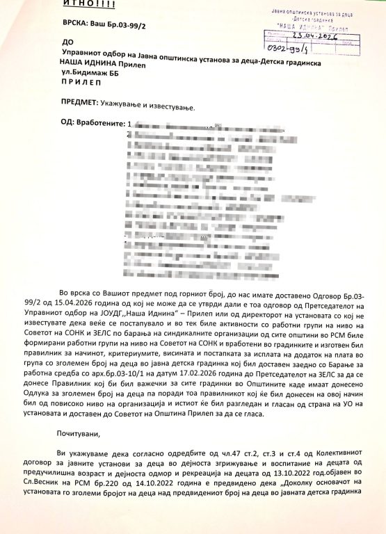 Дел од вработените во ЈОУДГ „Наша Иднина“ од Прилеп реагираат поради одложувањето на исплатата на надоместокот за работа во групи со зголемен број на деца.